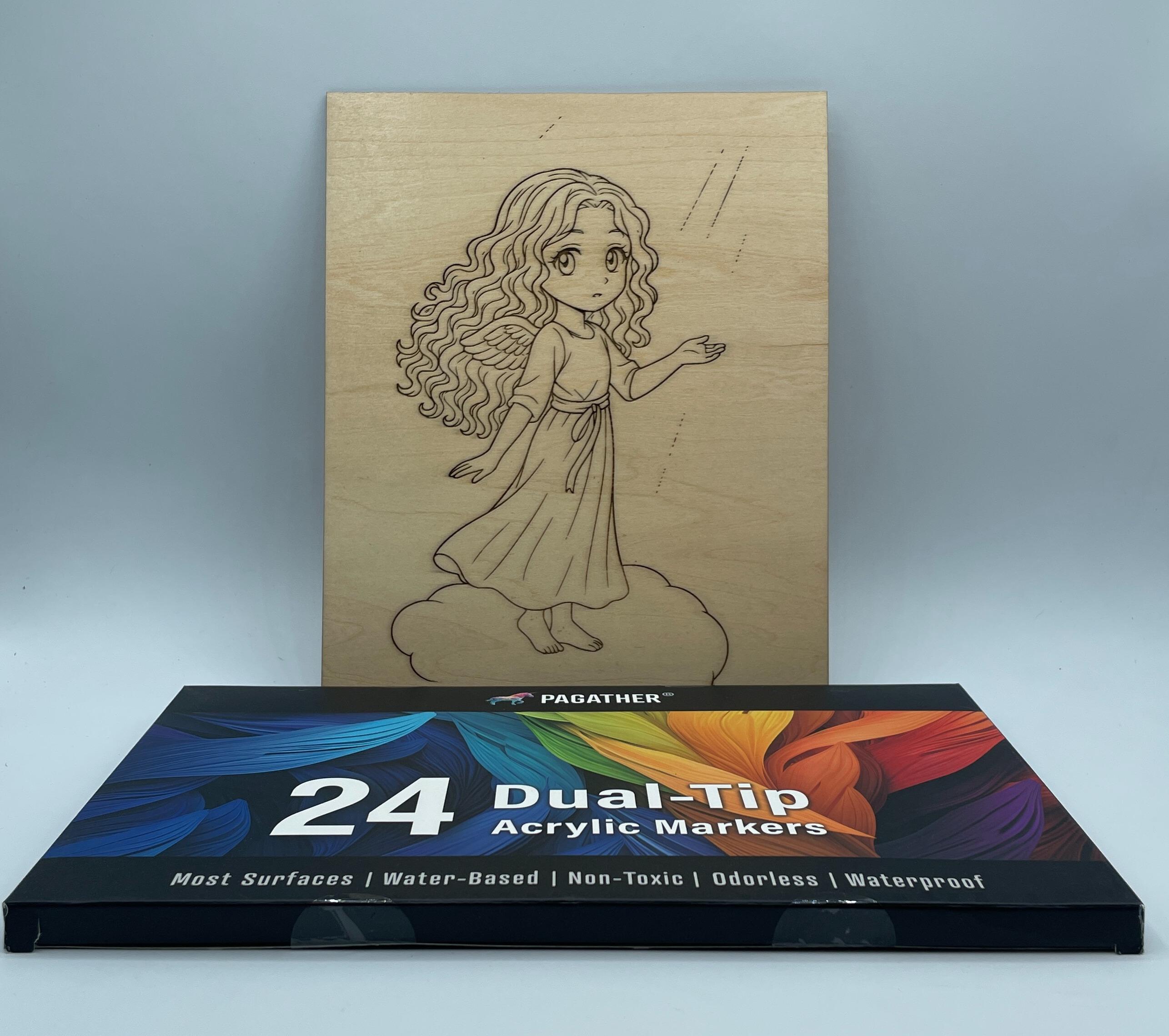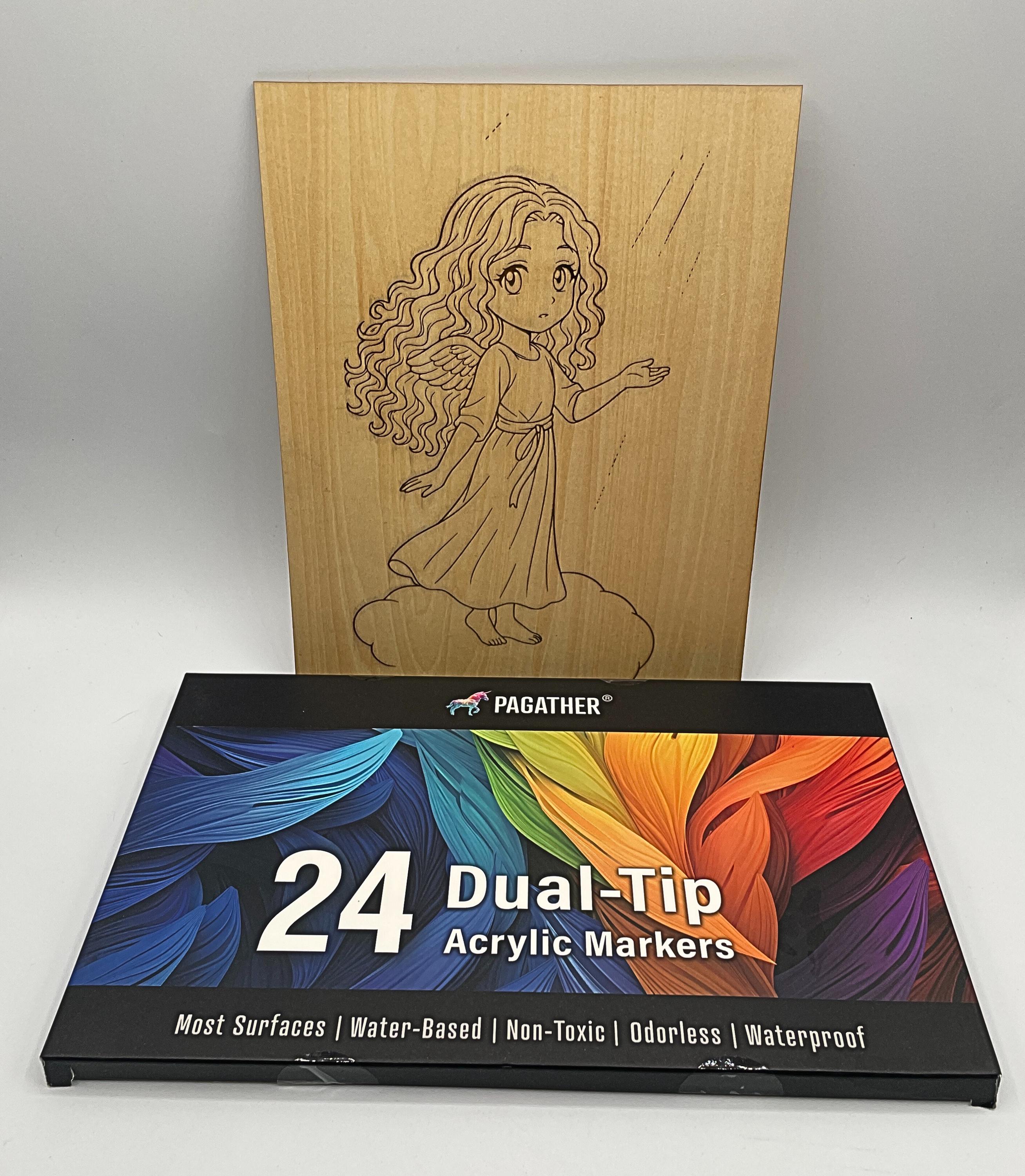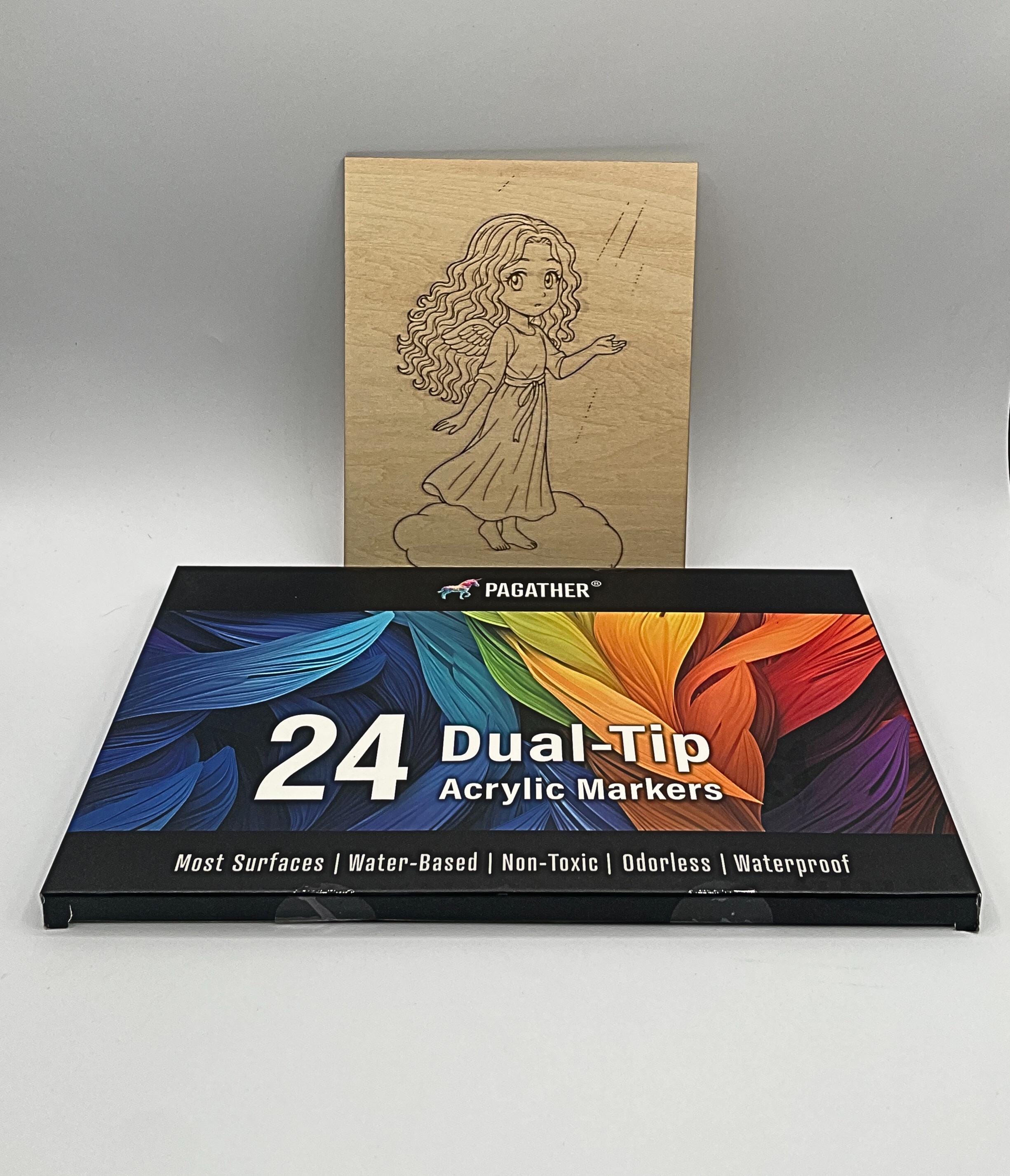 To make coloring simple and effortless, you can add a set of *Pagather 24-count dual-tip acrylic markers*. I chose these because they color beautifully on the primed wood panels and offer both fine tips for detail and brush tips for smooth shading. Alcohol markers are NOT recommended for these panels! Please see the Specialty Paper option for coloring with alcohol markers!