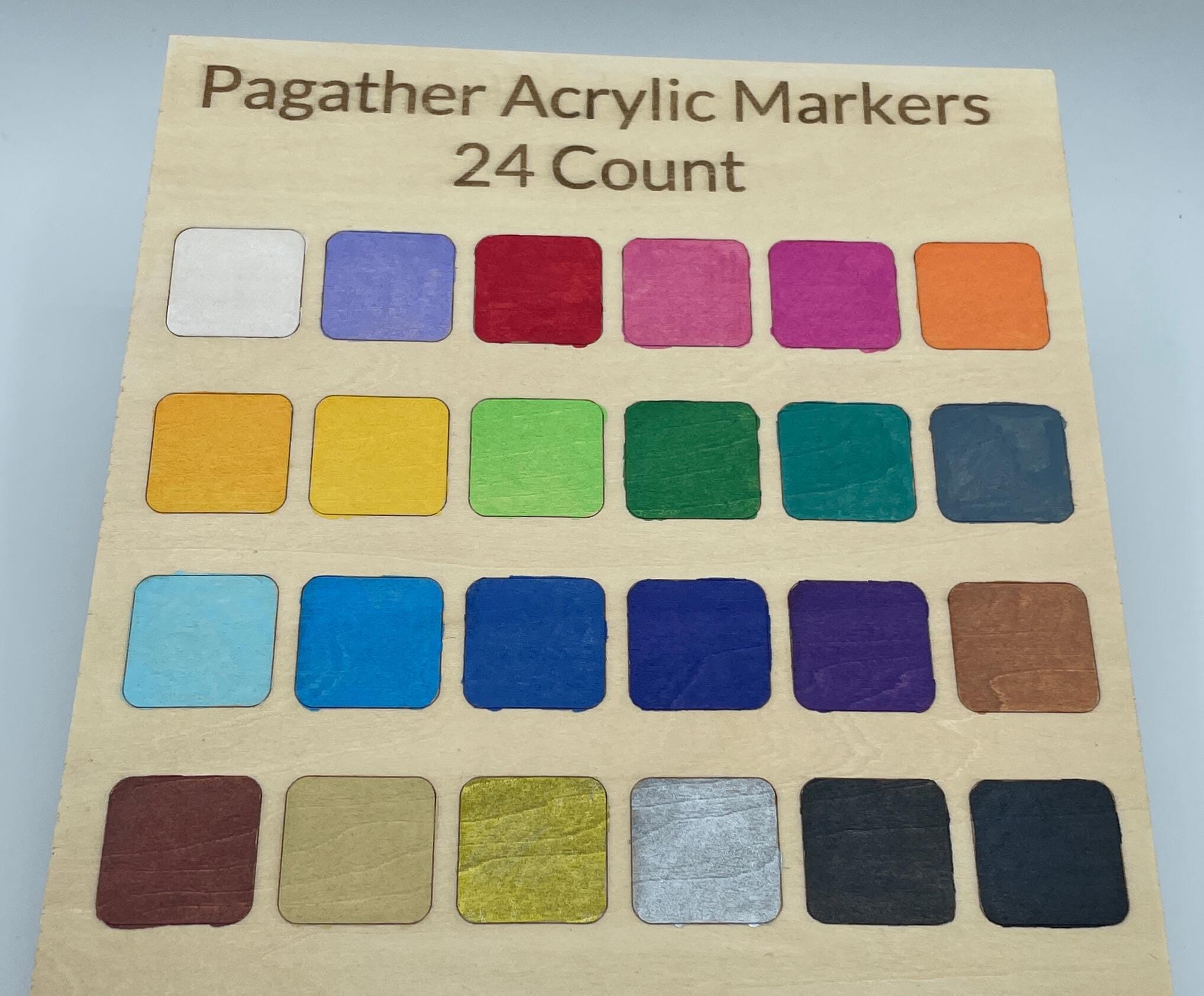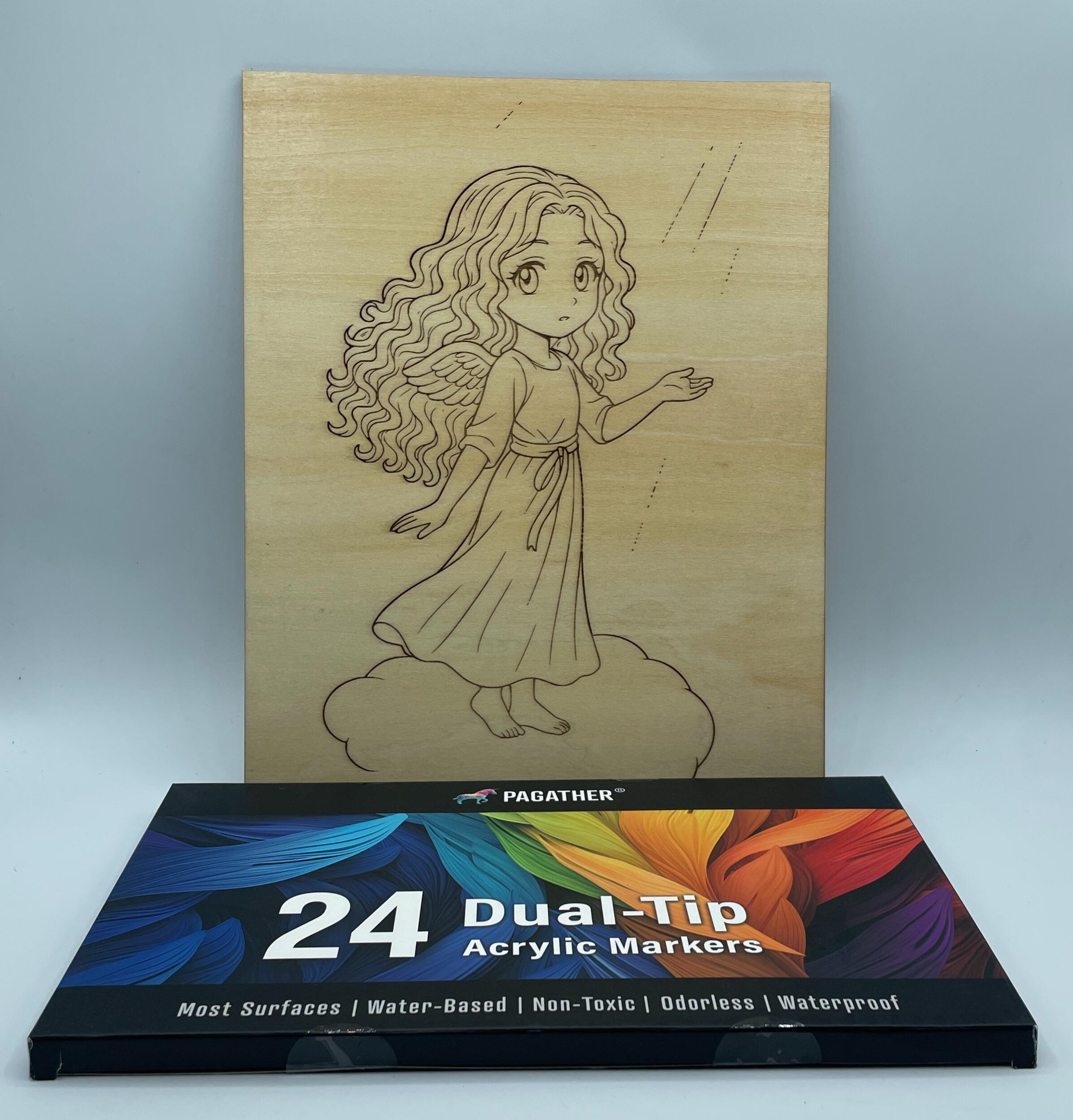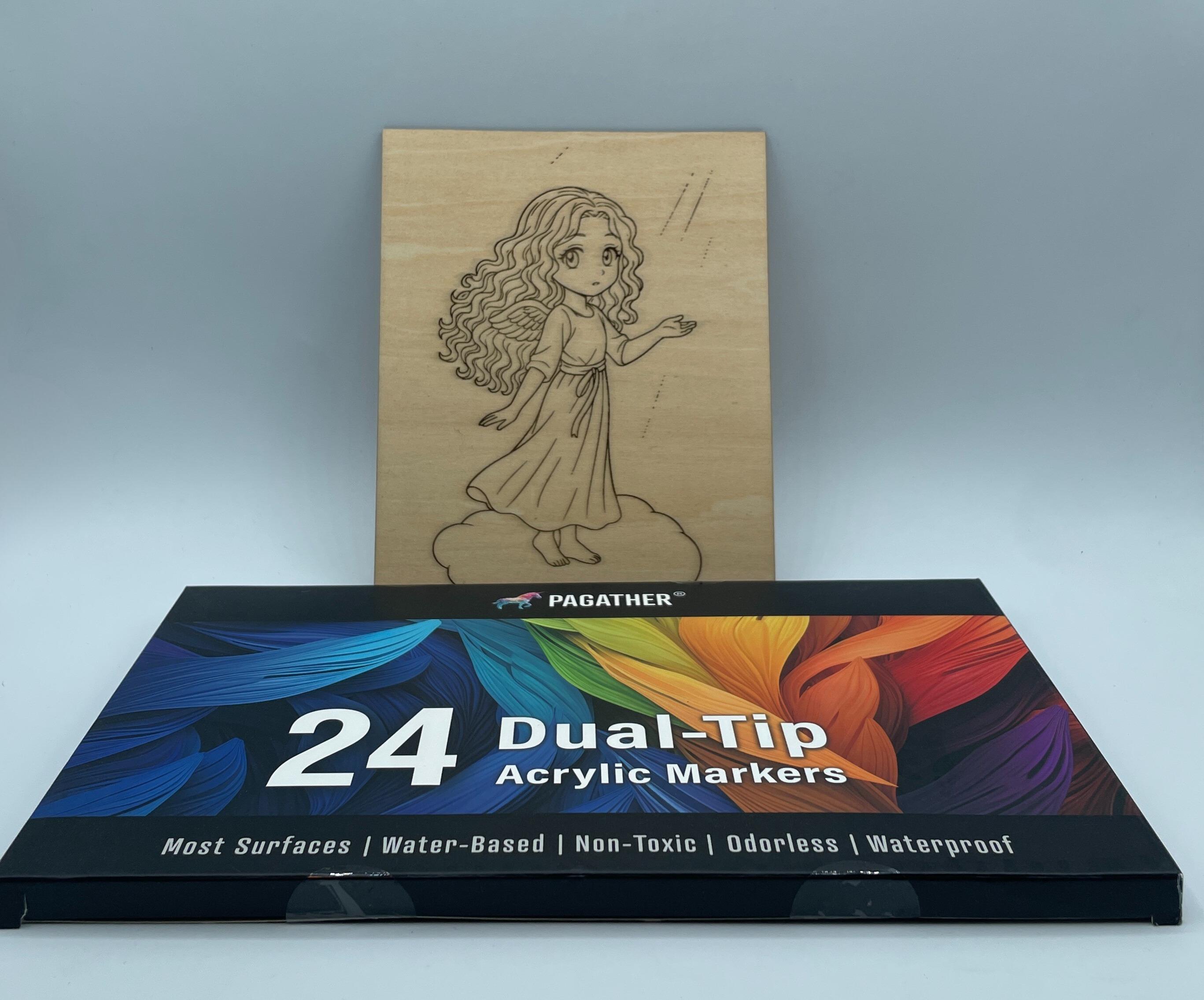 To make coloring simple and effortless, you can add a set of *Pagather 24-count dual-tip acrylic markers*. I chose these because they color beautifully on the primed wood panels and offer both fine tips for detail and brush tips for smooth shading. Alcohol markers are NOT recommended for these panels! Please see the Specialty Paper option for coloring with alcohol markers!